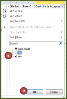 9. Now that we have the restaurants that deliver in the West Village delivery radius, we realize that we must pay with credit card as there is not much is our wallet. Scroll to the right and filter on the Credit Cards Accepted column (J). This time make sure Yes is selected.